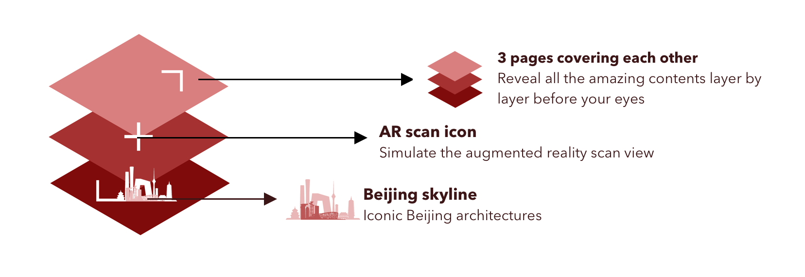 The “Unfold Beijing” project creates a conceptual AR solution for Beijing tourism industry. With the combination of an interactive brochure and AR scan application, tourists can enjoy a robust multi-media Beijing tour and get to know more about this city. The “Unfold Beijing” project is expected to provide the tourists with an enhancing AR experience when exploring the city. This project consists of two parts. One is this interactive printed brochure. Another is the AR scan mobile application.