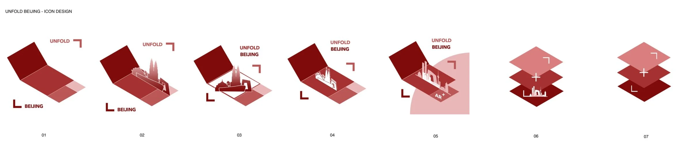 • The inspiration for the logo came from the name of this project. Therefore, I drafted different kinds of shapes and tried several icon combinations that may best reveal the word “unfold”. At last, the logo on the right outweighed others by its simple shape and clear explanation. It included all the required elements of this project: Augmented reality scan function, revealing brochure pages and the city Beijing.