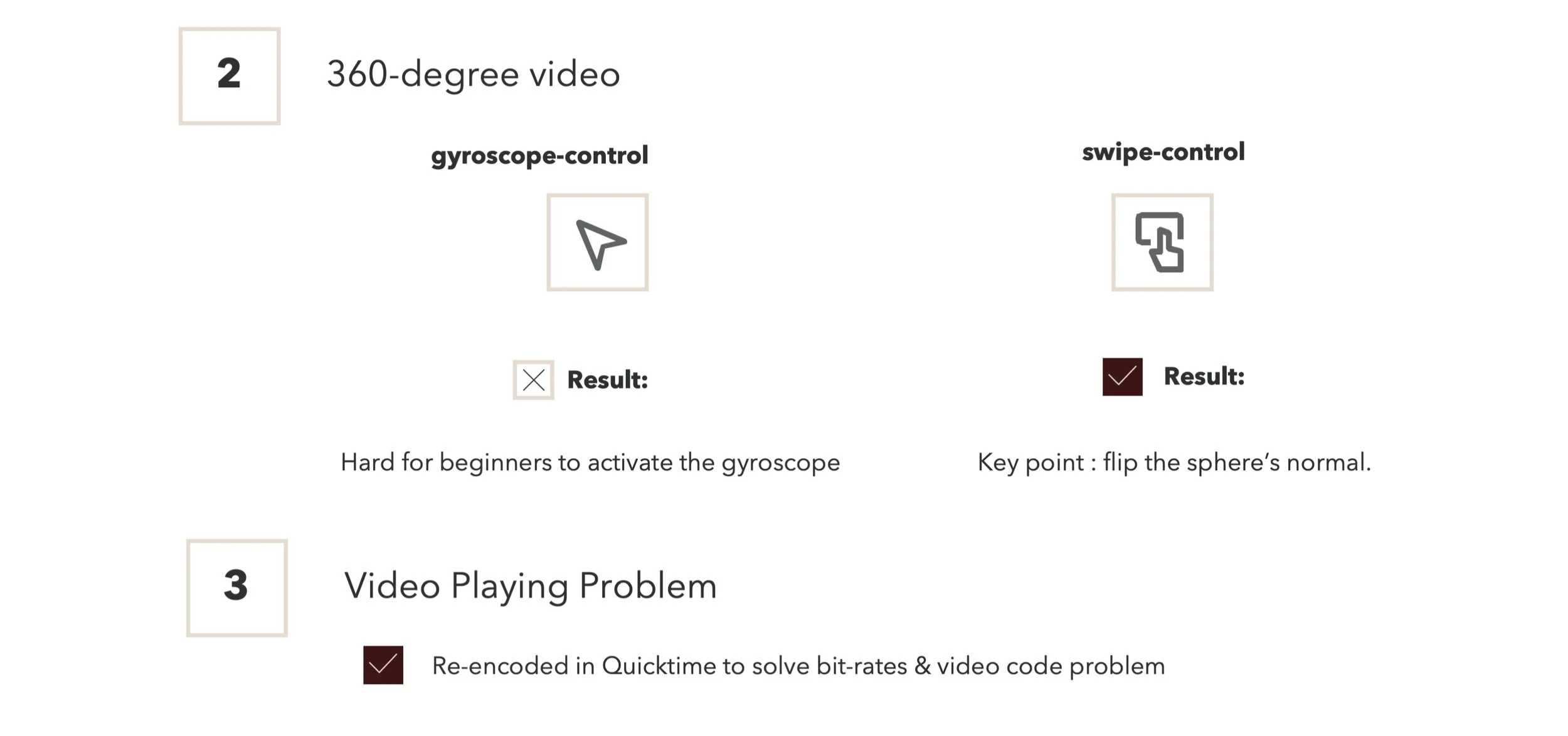 02 The second problem I’ve met is to create a 360 degree video. The ideal solution is to use the gyroscope, but I finally choose to use the swipe control. One reason is that I can’t find a real 360-degree video for the greatwall. So if I use the gyroscope, it may lower the user watching experience.