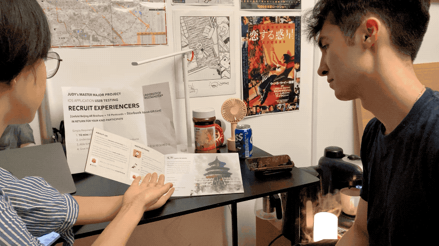 In order to detect the design flaw and learn about real user experiences, user testing is an essential step to be taken by designers and developers. As for this project, the choice of user testing method has its particularity. Since the application is an IOS-based only mobile application, real obstacles exist in downloading and setting this application prototype. That is, this application can only be tested on a particular iPhone that has been pre-installed the testing version. Unlike other mobile applications, augmented reality scan application is highly connected with physical printed products. It has no meaning if the test cuts the internal interactions between these two parts. Thus, testing has to involve the physical brochure to uncover the interactive issues between the brochure and the application. Considering the above factors, I choose to adopt the moderated usability test method for this project.